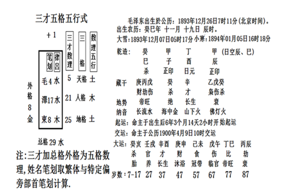 而汉字本身的吕律五行;为(水)泽(水)东(木),二水生木,毛字之水润天格土生人格之木,比助四柱印星,正是化杀扶命旺身,乃是大贵极佳的命易五行的配置。