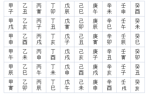 ④懂得将十天干与十二地支相配,阳干配阳支,阴干配阴支,干支全部配完刚好六十组干支,称为六十花甲子,如下图所示: