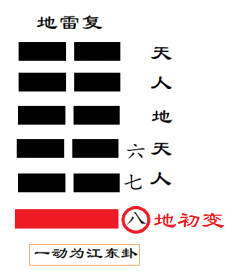◎卦运:通过对比内卦与外卦来判定。若只有一爻变动,则属于江东卦,其卦运仅限于八、七、六。具体而言,初爻变动为八运卦,二爻变动为七运卦,三爻变动为六运卦;顺而推之,由此便知,此卦为八运卦;见下图“地雷复”卦象释解。